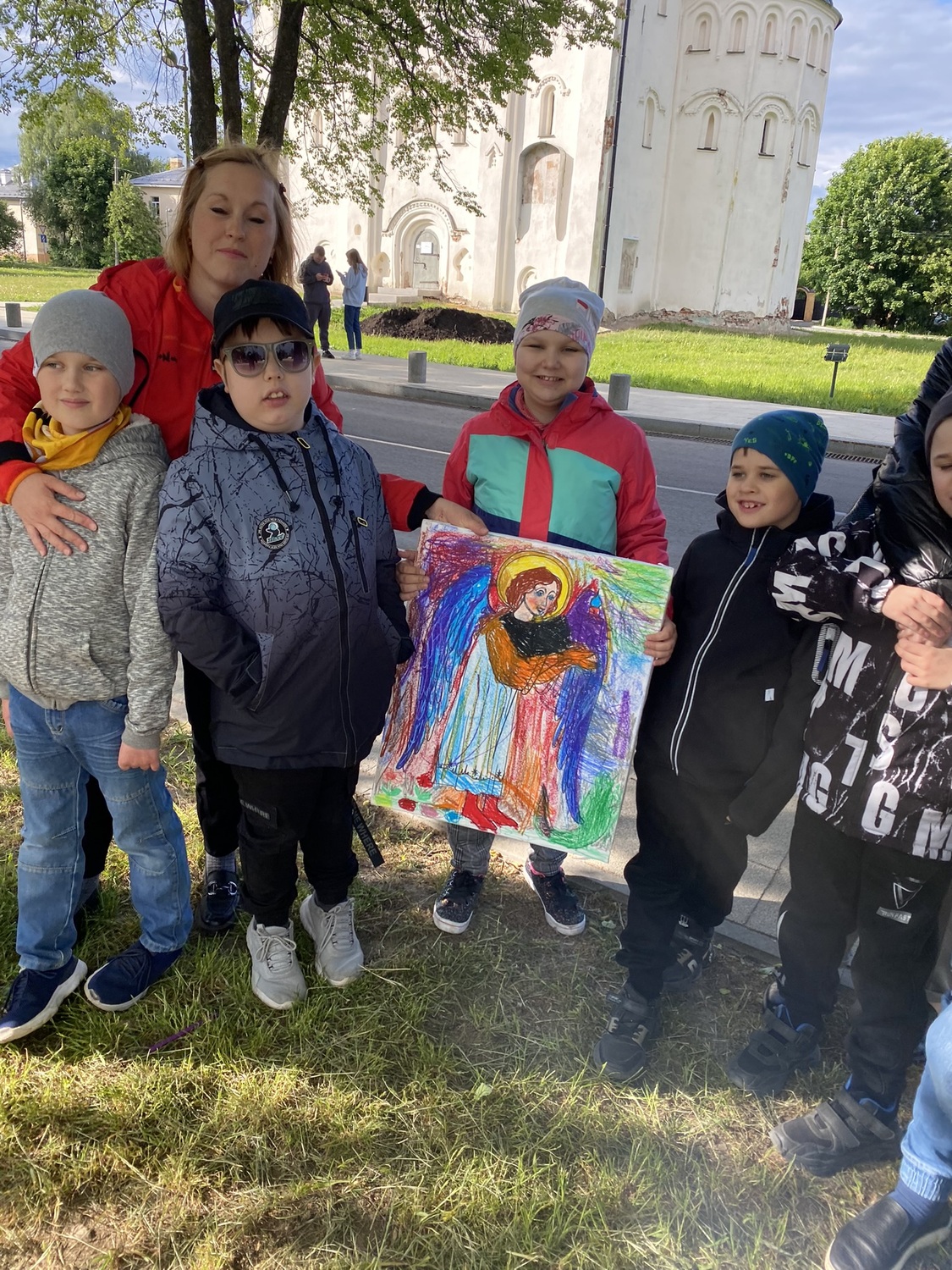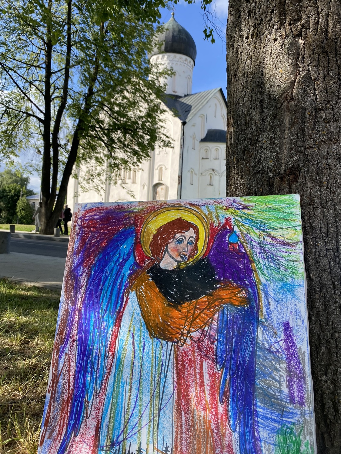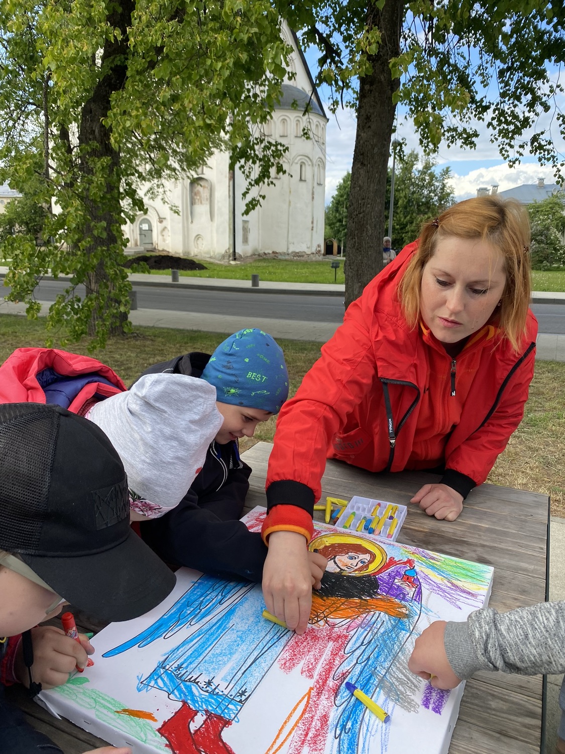 В тёплую сухую погоду можно в завершение экскурсии провести небольшой творческий мастер-класс по изученной теме. Можно натянуть бумагу на планшет для рисования от 50х60см и заранее контуром изобразить на нём то, что мы изучали- например, если мы заходили в Знаменский собор смотреть росписи, то нарисовать ангела или иную часть фрески. После экскурсии собрать детей, выдать им восковые мелки или масляную пастель(иные материалы, клеевые блестки и др)и вместе сделать творческую работу. Интерес к различным сенсорным стимулам- другая особенность детей с РАС, как правило, им интересны яркие цвета, необычные фактуры, творческая деятельность.